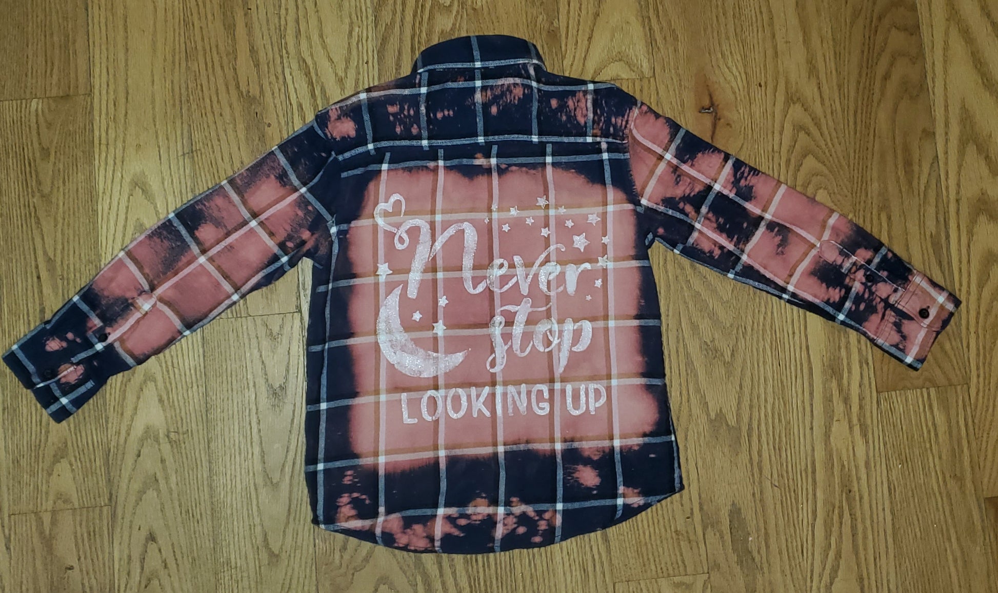 One of a kind distressed flannel. Graphic back. "Never stop looking up"